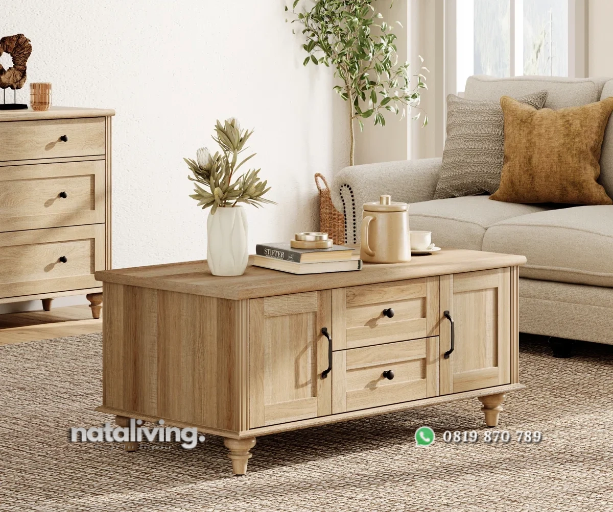 ini akan merubah ruang tamu Anda dengan sentuhan stylish namun praktis. Lihatlah meja tamu ini yang tidak hanya terlihat menawan tetapi juga dilengkapi dengan penyimpanan multifungsi yang praktis, sempurna untuk menyimpan majalah, remote, dan barang-barang penting lainnya. Finishingnya juga memberikan nuansa hangat, memperindah desain modern nya, dan membuat ruang Anda terasa lebih ramah. Meja tamu ini akan menjadi pusat perhatian yang menawan di ruang tamu Anda.