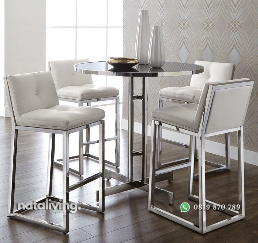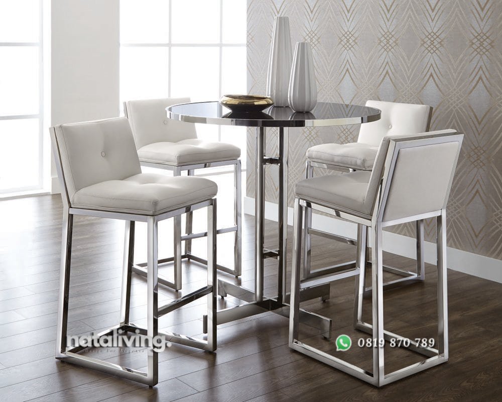 Set meja makan bar dengan sentuhan mewah, kerangka dari stainless, untuk alas meja dari kaca dan kursi terdapat busa yang empuk. Ruang makan akan terlihat lebih istimewa.