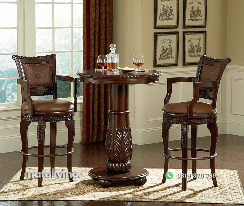 Set meja makan bar dengan nuansa klasik. Meja dan kusi dihias dengan ukiran cantik. Tampilan warna coklat yang mengilap. Set meja makan terdiri dari 1 meja dan 2 kursi.