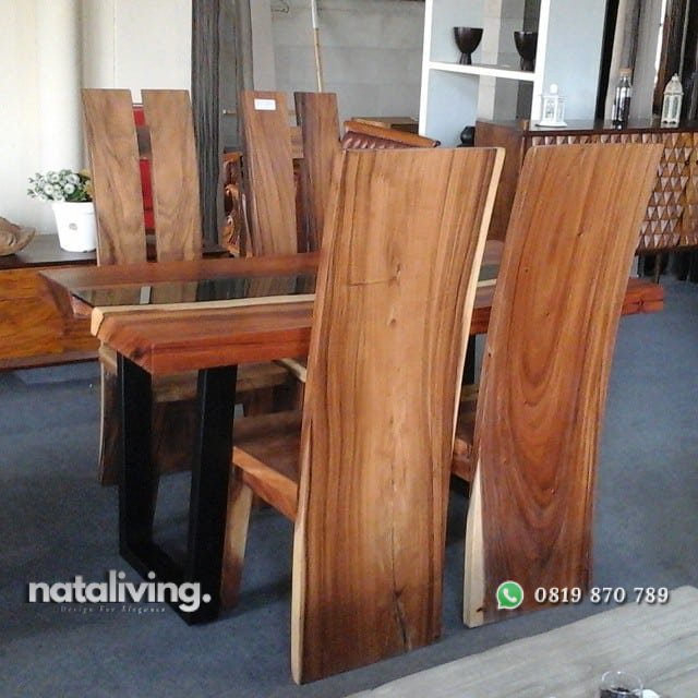 Set meja makan dengan sentuhan gaya kontemporer, meja makan memiliki bentuk yang indah, sambungan kayu dengan kaca ada ditengah dan kaki dari besi. Sementara itu kursi dengan sandaran yang berbeda menjadi daya tarik tersendiri.