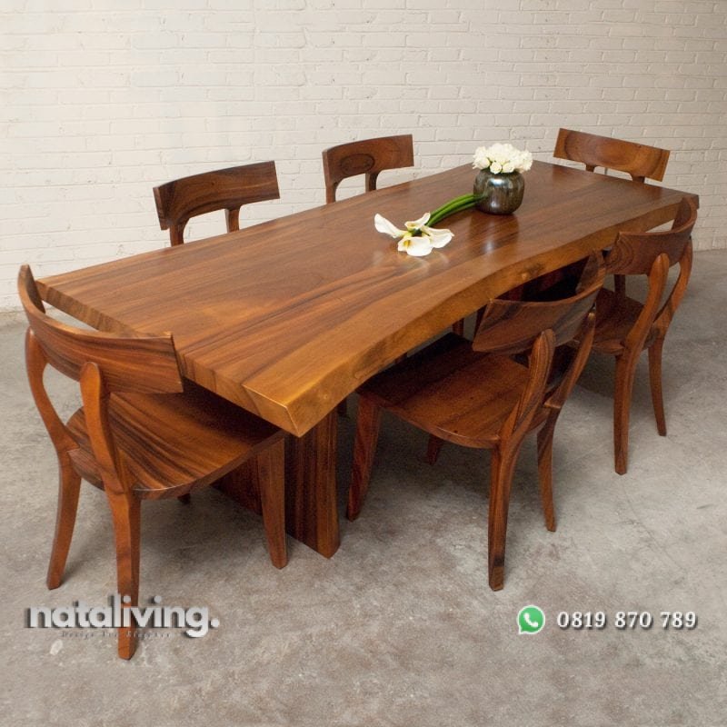 Set meja makan ini terbuat dari kayu solid yang kuat, bagian top meja utuh tanpa sambungan dengan ukuran panjang 250 cm dan bisa dipakai max untuk 10 kursi, akan tetapi display kami memakai 6 kursi saja.