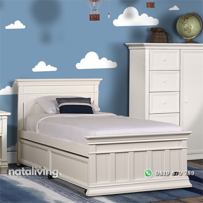 1 Set tempat tidur anak dengan desain minimalis dan berkarakter, model sorong jadi anda bisa menempatkan 2 kasur sekaligus untuk satu ranjang anak ini.