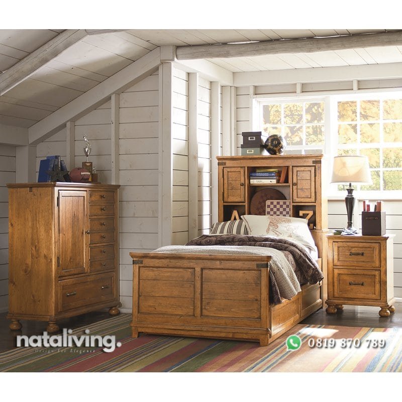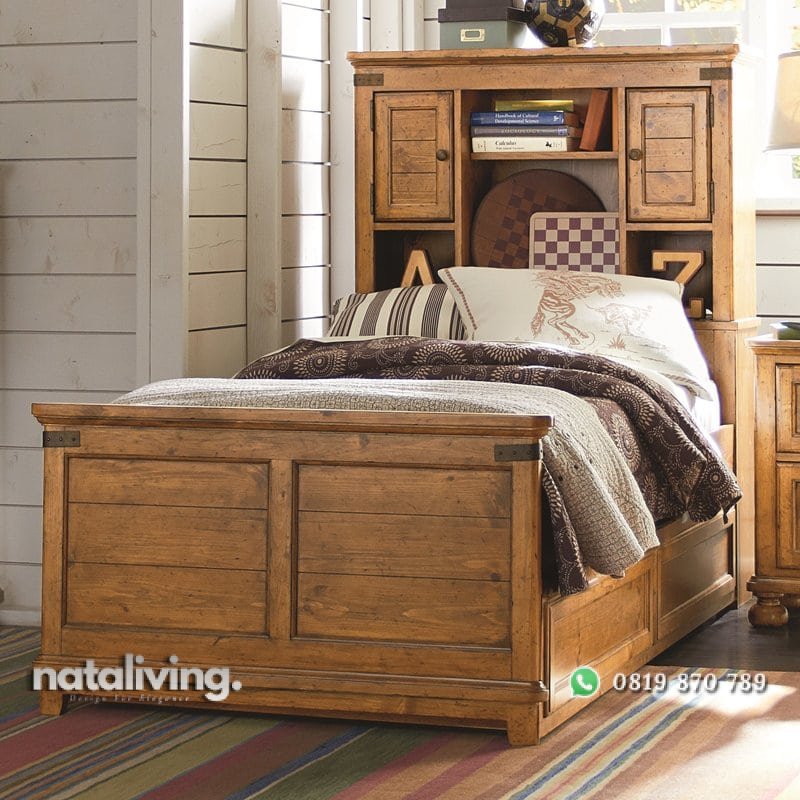 Set tempat tidur anak ini memiliki tampilan bergaya klasik, selain itu model tempat tidur yang sangat multifungsi, desain minimalis dengan bentuk tempat tidur yang memiliki pintu kecil dan rak pada bagian sandaran kepala (headbroad)