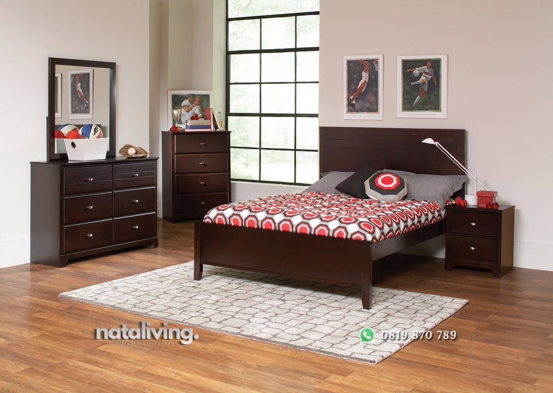 Set tempat tidur ini terbuat dari kayu jati kualitas terbaik dari Jepara. Kontruksi kuat dan awet. Desainya simpel, gaya minimalis yang modern. Terdiri dari tempat tidur, nakas, drawers dan meja rias.