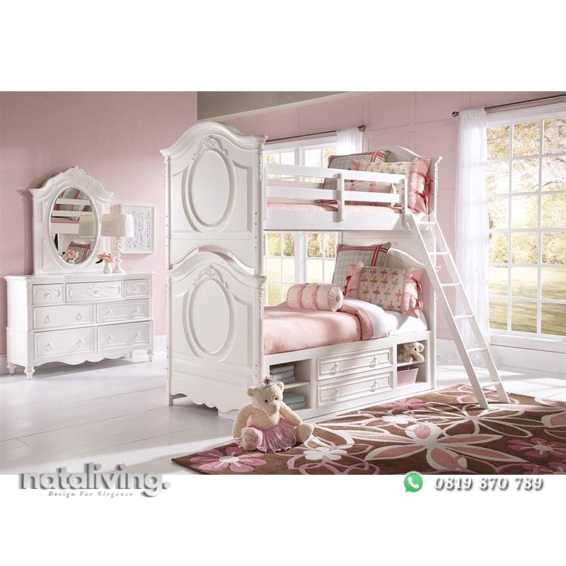 Telah didesain khusus dengan pesona indah sesuai selera kaum milenial. Set tempat tidur tingat membawa sentuhan ukiran yang diubah dengan gaya modern. Menampilan nuansa anak perempuan yang dipadu dengan lapisan warna yang elegan. Kamar tidur akan tampil mewah dan cantik