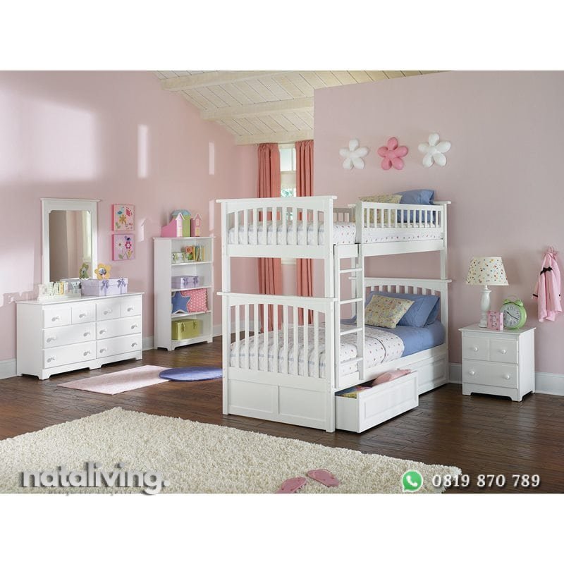 Set tempat tidur tingkat ini terbuat dari kayu mahoni dengan finishing cat duco putih, untuk paket harga ini anda sudah mendapatkan 4 item barang yang ada di gambar, yakni tempat tidur, meja rias, nakas dan lemari rak, selain itu anda juga bisa memesan dalam satuan atau bisa menambahkan furniture lain seperti contoh anda ingin menambahkan meja belajar atau lemari baju.