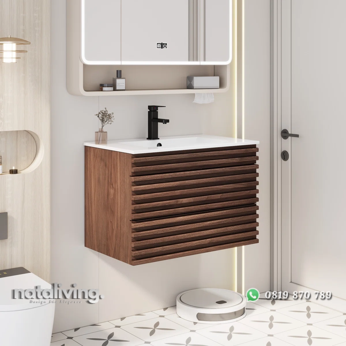 Hadirkan pesona kemewahan dalam ruang kamar mandi dan salah satu tempat cuci tangan ataupun membasuh muka Anda yaitu dengan produk ini sangat cocok untuk menjadi salah satu pilihan bagi Anda. Karena desain dari produk Wastafel Cabinet ini sangat elegant dengan mengusung tema minimalis bergaya modern yang sangat modis dan kekinian. Serta memiliki visual yang menawan berkat lapisan warna cat finishing melamine sehingga produk ini menambah kesan mewah juga elegant. Dan pastinya, bahan baku utama dari produk Wastafel ini diolah dengan menggunakan Kayu Jati Perhutani sehingga terjamin akan mutu, awet dan kualitasnnya.
