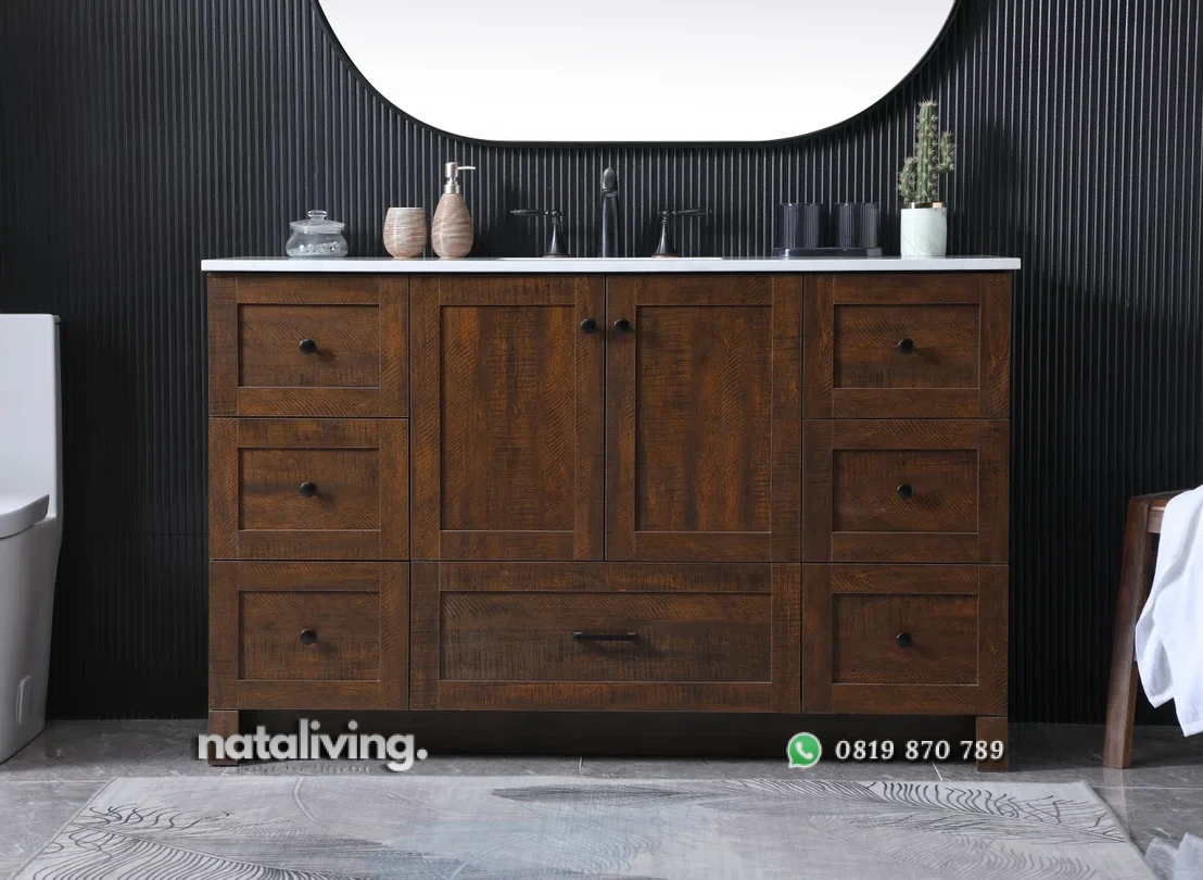Hadirkan pesona kemewahan dalam ruang kamar mandi dan salah satu tempat cuci tangan ataupun membasuh muka Anda yaitu dengan produk ini sangat cocok untuk menjadi salah satu pilihan bagi Anda. Karena desain dari produk Wastafel Cabinet ini sangat elegant dengan mengusung tema minimalis bergaya modern yang sangat modis dan kekinian. Serta memiliki visual yang menawan berkat lapisan warna cat finishing melamine yang menyesuaikan produk ini sehingga menambah kesan mewah juga elegant. Dan pastinya, bahan baku utama dari produk Wastafel ini diolah dengan menggunakan Kayu Jati Perhutani sehingga terjamin akan mutu, awet dan kualitasnnya.