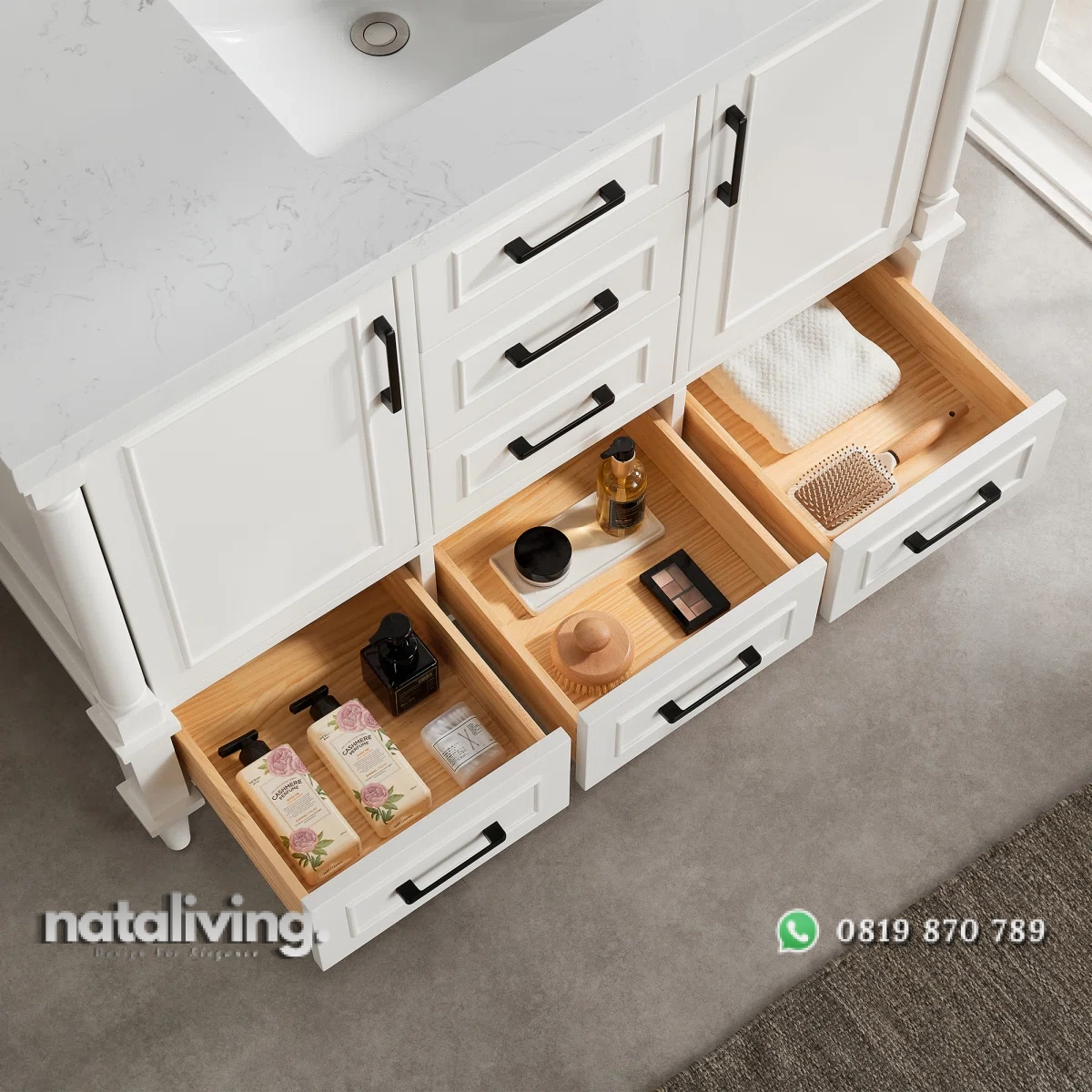 Hadirkan pesona kemewahan dalam ruang kamar mandi dan salah satu tempat cuci tangan ataupun membasuh muka Anda yaitu dengan produk ini sangat cocok untuk menjadi salah satu pilihan bagi Anda. Karena desain dari produk Wastafel Cabinet ini sangat elegant dengan mengusung tema minimalis bergaya modern yang sangat modis dan kekinian. Serta memiliki visual yang menawan berkat lapisan warna cat duco putih sehingga menambah kesan mewah juga elegant. Dan pastinya, bahan baku utama dari produk Wastafel ini diolah dengan menggunakan kayu mahogany bercampur mdf sehingga terjamin akan mutu, awet dan kualitasnnya.