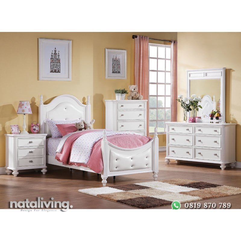 Satu set terdiri dari Tempat Tidur, Nakas, Drawers dan Meja Rias. Didesain minimalis modern tanpa ukiran dengan tampilan warna putih. Untuk tempat tidur, ini telah dilengkapi jogjogan yang empuk di bagian sandaran kepala dan sandaran kaki.