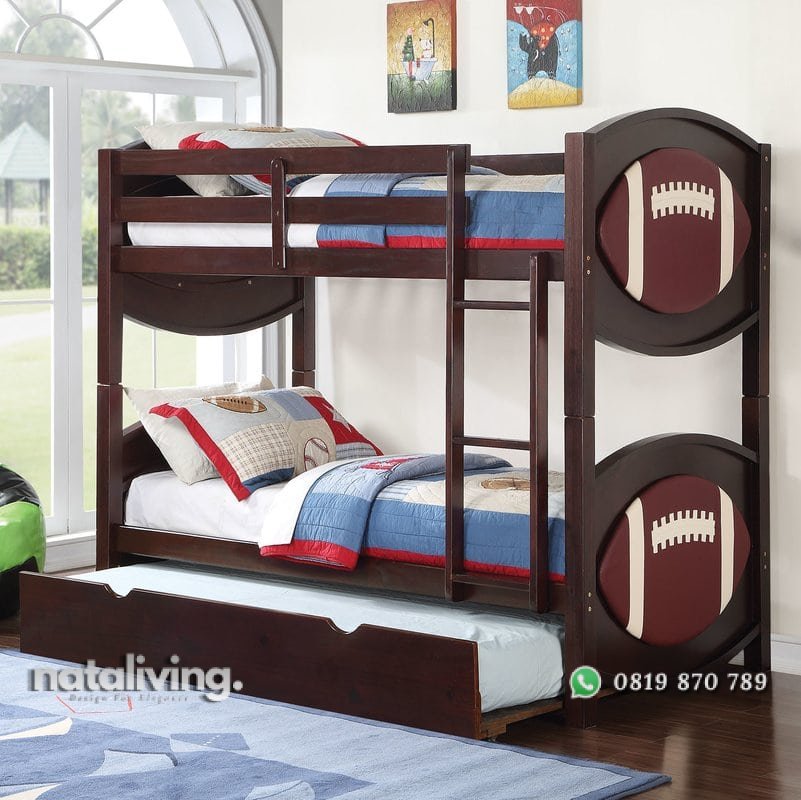 Tempat tidur tingkat ini dikonstruksi dari kayu jati yang kuat, didesain minimalis modern dan terdapat kain sofa di bagian sisi kakan dan kiri sehingga menjadi daya tarik tersendiri, bentuk tetap simpel dilengkapi pula sorong kasur yang dapat digunakan untuk tempat bermain anak.