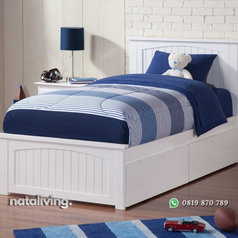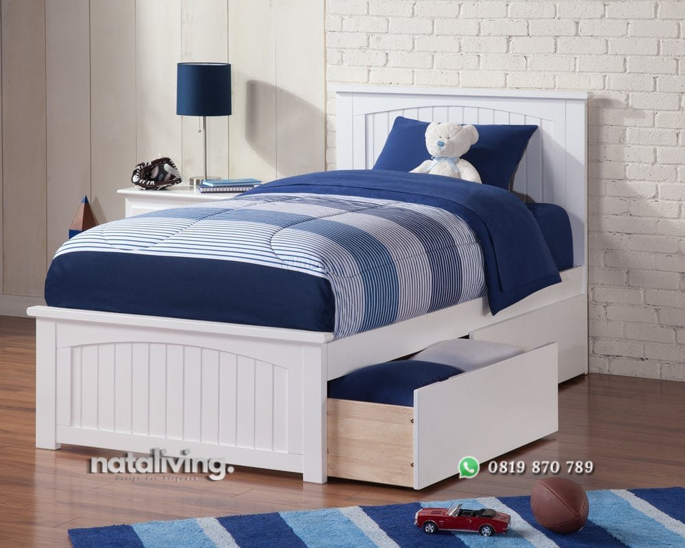 Tempat tidur anak ini memiliki desain minimalis dengan tampilan yang cantik. Warna putih cerah yang terkesan bersih. Untuk bentuknya banyak digemari, terdapat laci bisa menaruh mainan anak.