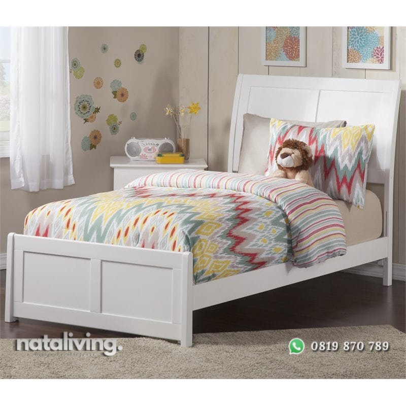 Tempat tidur anak dengan desain minimalis tampil simpel nan cantik, sandaran dibuat melengkung yang kuat, terbuat dari kayu pilihan dengan konstruksi yang sudah teruji.