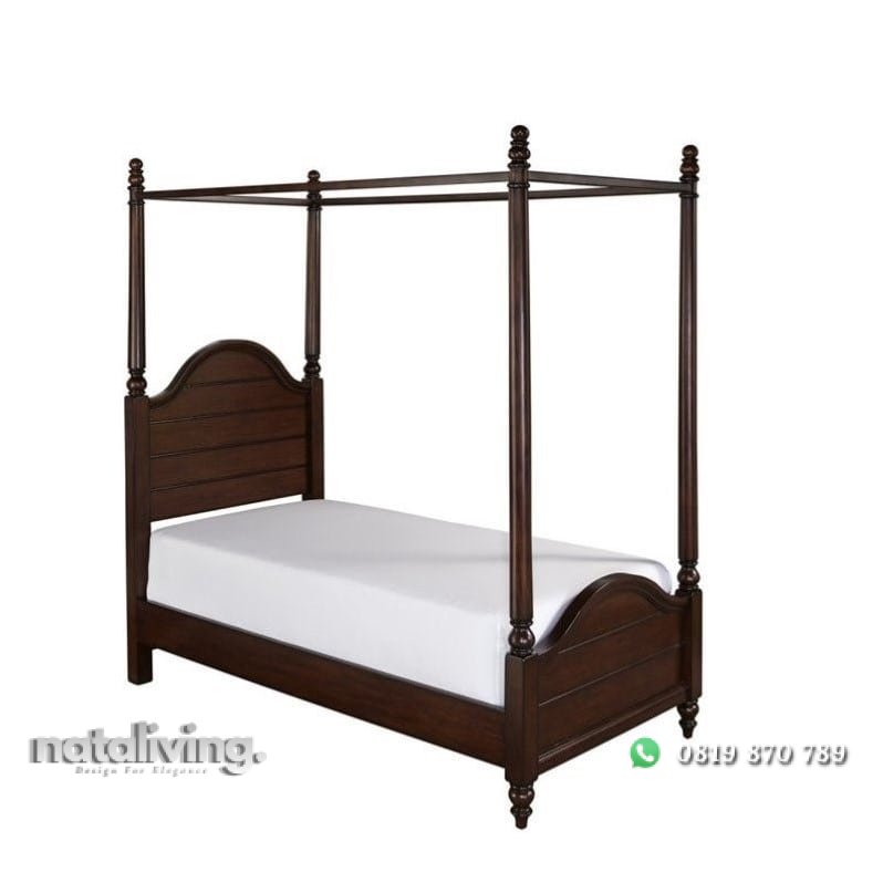 Tempat tidur anak kanopi dengan pilar tinggi di 4 sisi tempat tidur ini memiliki model yang unik dengan motif yang menarik, salah satu produk terbaru desain klasik dari Jepara Heritage.