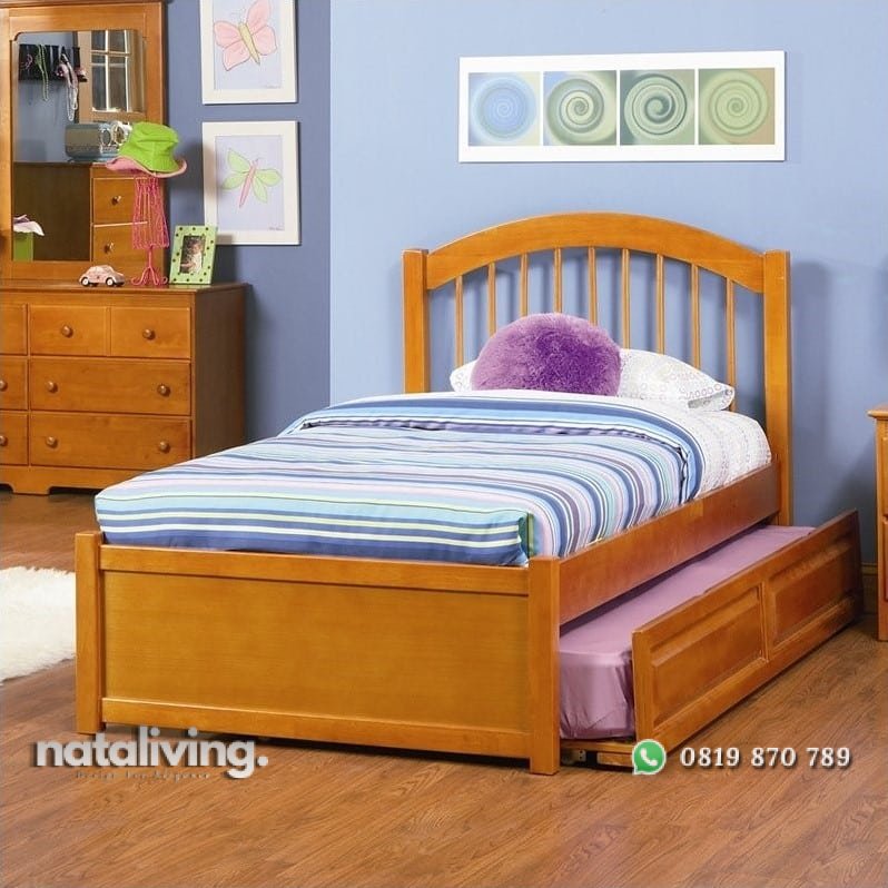 Untuk desain ini kami memakai kayu mahoni sebagai bahan utamanya, produk ini memiliki kasur sorong dibagian kolongnya dan anda bisa gunakan untuk 2 anak dengan membeli 1 produk kami.