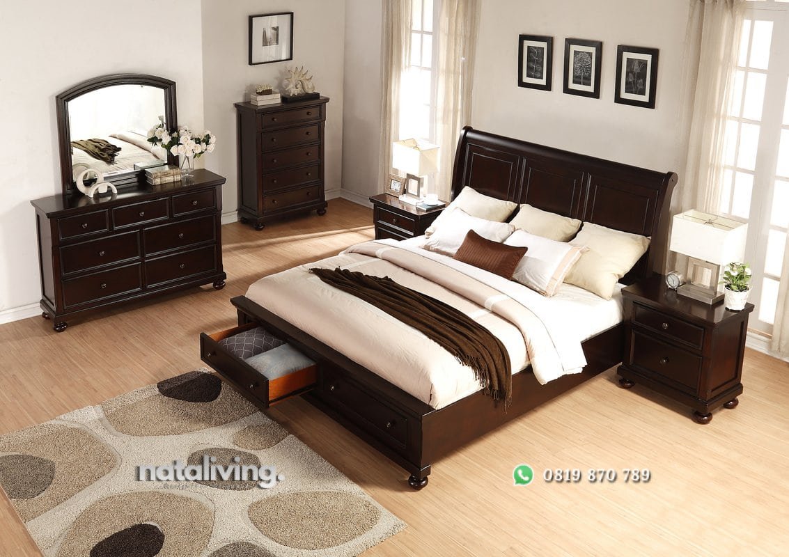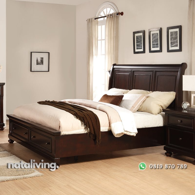 Tempat tidur terbuat dari kayu jati yang dikonstuksi dengan kuat, pengerjaan dilakukan langsung dari Jepara oleh pekerja yang sudah berpengalaman, desain memiliki tampilan modern, ukuran tempat tidur orang dewasa, tempat tidur dilengkapi dua laci penyimpanan.