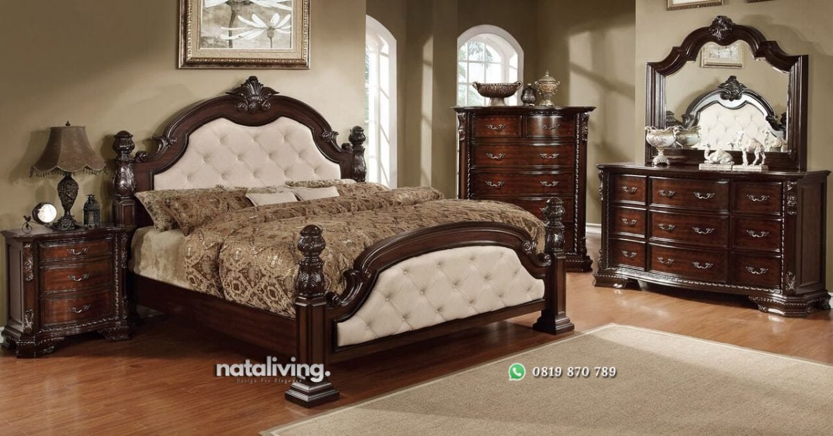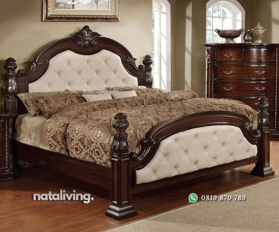 Tempat tidur dengan desain yang mewah ini dihias dengan ukiran yang berkelas. Konsep tampilannya mengusung gaya klasik dengan warna yang mendukungnya. Headboard dan footboard juga ditambah balutan sofa yang terkesan lebih cantik. Kami juga menyediakan satu set tempat tidur, silakan geser gambar ke 2 untuk melihatnya.