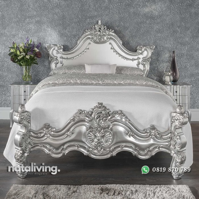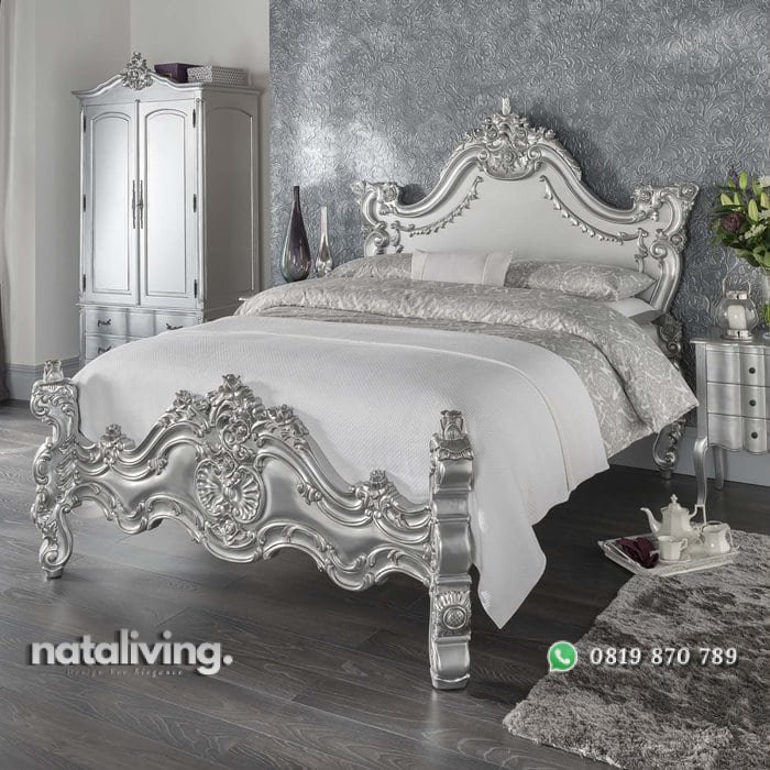 Tempat tidur ini terbuat dari kayu mahoni dengan ukiran khas kota Jepara yang terkenal rapi dan bagus, tersedia untuk 1 set kamar atau ecer, bagi anda yang suka desain French Furniture sangat cocok memakai desain ini.