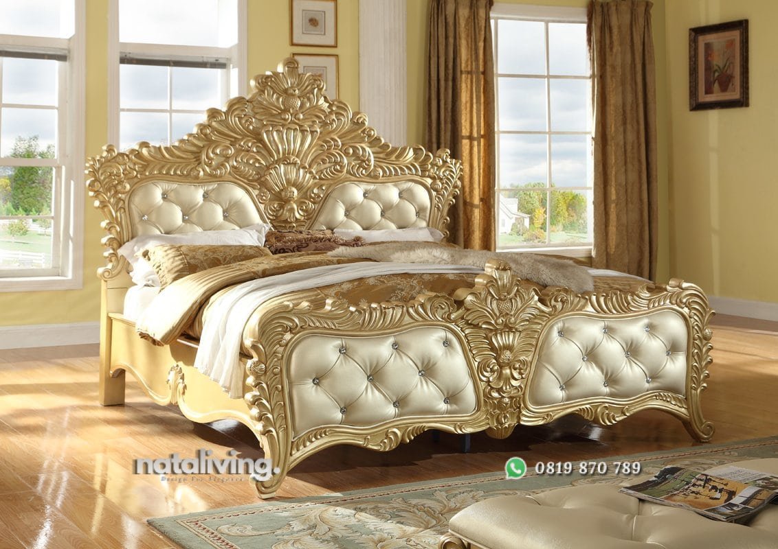 Tempat tidur mewah dan juga terlihat gagah dengan ukuran yang besar dan telah dibalut sofa lembut. Menampilkan ukir ukiran nilai artistik selera tinggi dengan tampilan warna emas kian terlihat lebih berkelas.