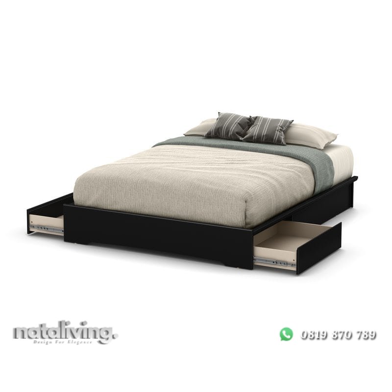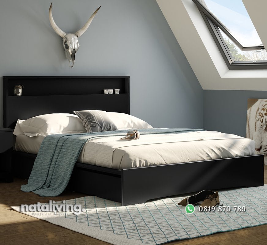 Tempat tidur minimalis ala japang dengan desain yang menarik. Bentuk minimalis simpel, tempat tidur tanpa kaki, namun tersedia tempat menaruh buku di bagian headboard.