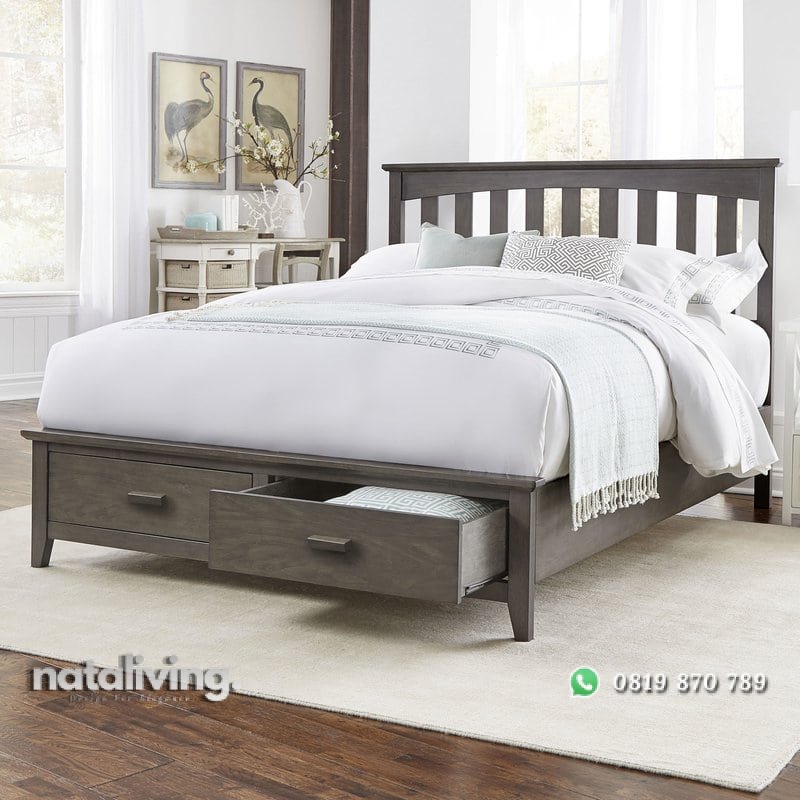 Tempat tidur minimalis dengan tampilan warna yang menarik. Bentuknya simpel, sandaran pagar. Tersedia 2 laci yang bisa digunakan untuk menyimpan barang.