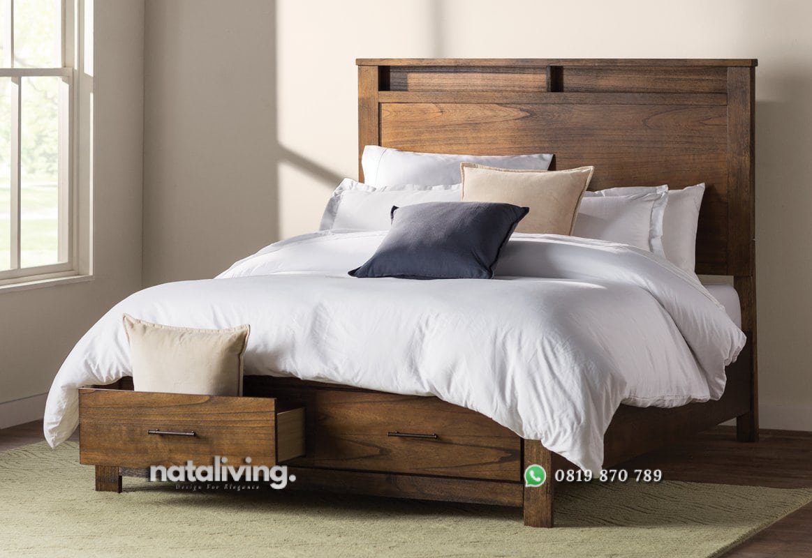 Tempat tidur dengan tampilan gaya rustic yang menarik. Warna finishing dibuat kumuh dan apa adanya ini menjadi ciri khas gaya rustic.