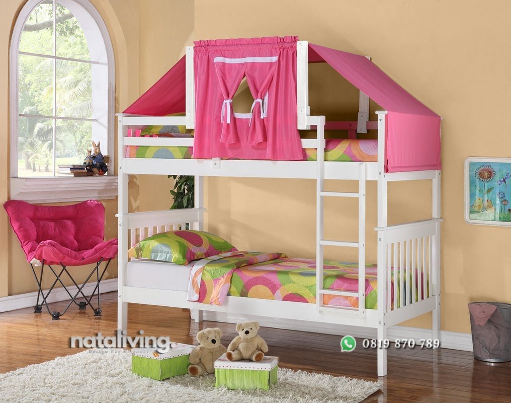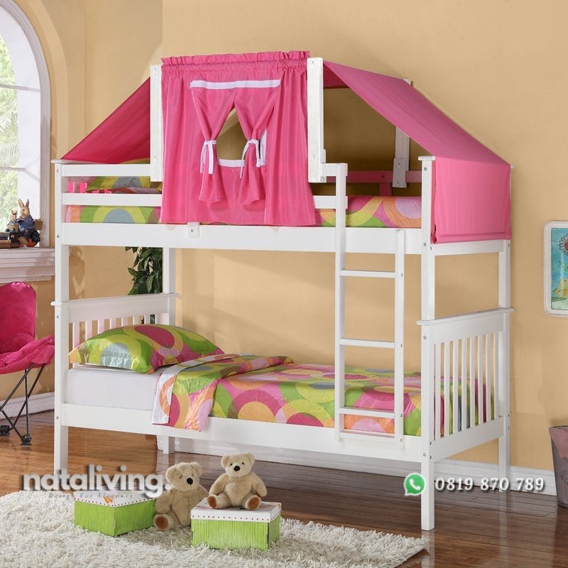 Tempat tidur tingkat model rumah dengan ukuran ranjang sama. Bagian atas ranjang terdapat kain yang bisa digunakan sebagai kelambu. Tersedia tangga untuk naik turun ranjang.