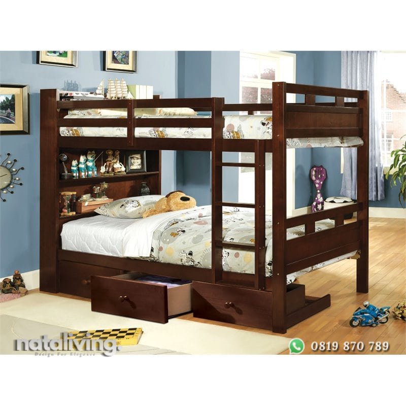 Tempat tidur tingkat dengan desain yang modern, pada bagian sandaran kepala dirancang khusus dengan papan kayu lebih besar dan dilengkapi penyimpanan. Tersedia juga tambahan laci di bawah tempat tidur.
