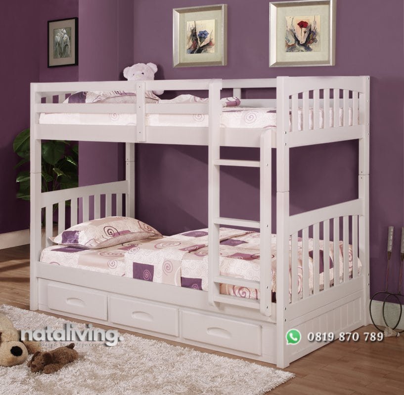 Tempat tidur susun dengan tersedia laci sorong sebagai penyimpanan barang anak. Desain bertema minimalis memiliki bentuk simpel dengan kesan yang lebih modern. Ada tangga yang sudah menyatu. Ukuran kasur ranjang atas dan bawah sama. Warna putih akan menampilkan kesan bersih di dalam kamar tidur.