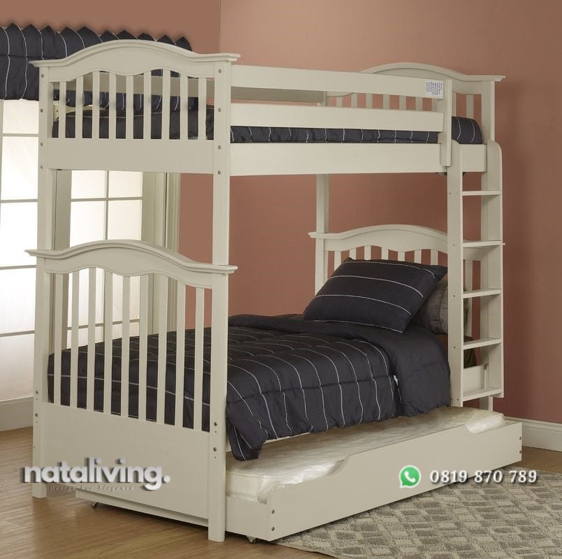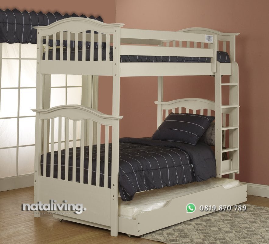 Tempat tidur tingkat ini memiliki ukuran ranjang yang sama dan sudah tersedia laci sorong di bagian bawah. Dengan terdapat laci sorong ini bisa digunakan sebagai tempat tidur tambahan atau sebagai tempat penyimpanan barang anak.