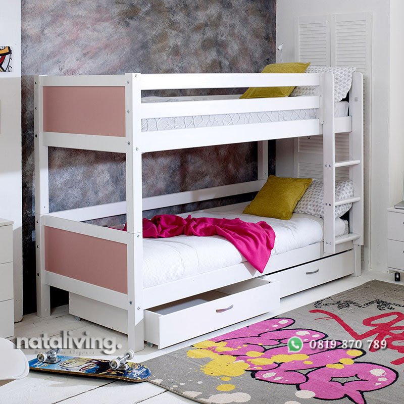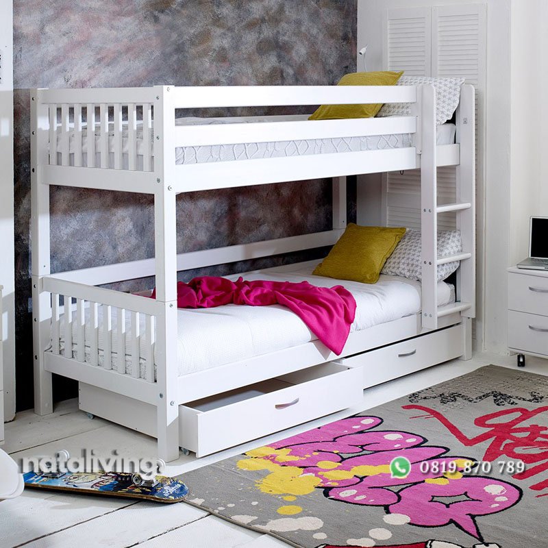 Produk ini merupakan salah satu varian terbaru yang kami tawarkan kepada anda untuk memenuhi kebutuhan tidur untuk ke dua anak anda. Hadeir dengan konsep minimalis simpel model terbaru yang dilengkapi 2 laci tambahan serta berlapis cat duco putih tebal, halus dan juga rapi. Tentunya kayu mahoni pilihan yang sudah dioven merukapan bahan utama produk ini, sehingga kontruksinya sangat kuat dan tahan lama.