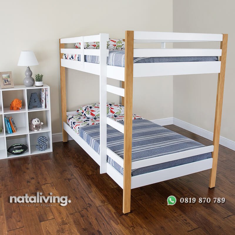 Hadir dengan konsep minimalis sederhana model terbaru dan terpopuler tahun ini yang terbuat dari bahan kayu mahoni oven piliha. Sehingga kontruksinya sangat kuat dan juga kokoh. Dan dengan sentuhan warna finishing putih kombinasi natural tampilannya semakin cantik dan juga menarik. Sehingga sangat tepat untuk melengkapi kebutuhan furniture untuk tidur bagi anak-anak anda.