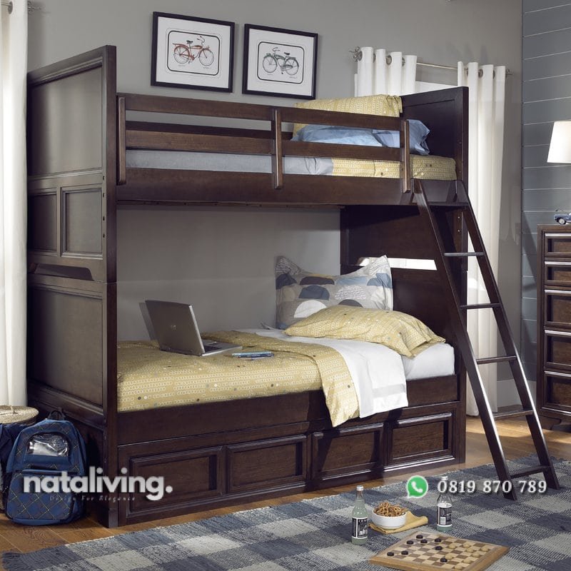 Tempat tidur tingkat dengan sentuhan gaya minimalis yang sederhana. Terdapat 4 laci yang bisa dugunakan untuk menyimpan mainan anak atau lainya. Terbuat dari kayu jati dengan konstruksi yang kuat dan kokoh.