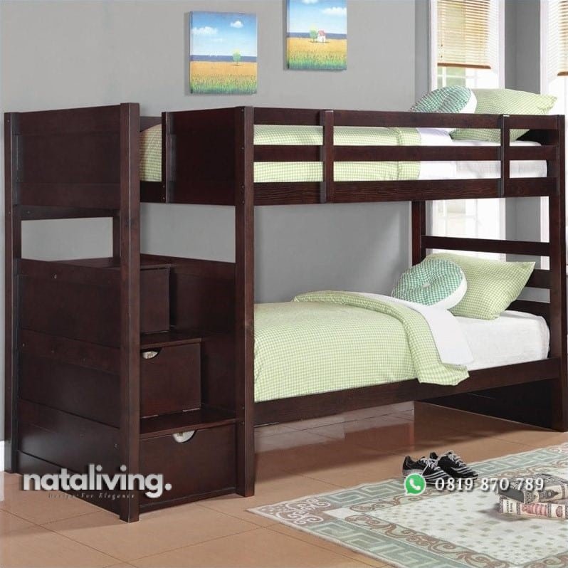 Tempat tidur tingkat dengan dilengkapi tangga yang sudah tersedia laci sebagai tempat menyimpan barang anak. Ukuran ranjang sama dan ranjang atas terdapat full pagar.